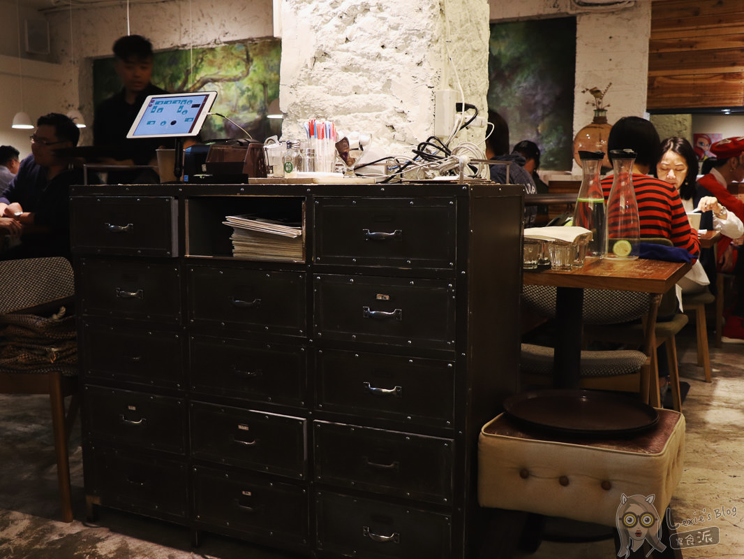 我很喜歡餐廳的設計。外面空地上也擺了很多桌椅 ,如果天氣不是太熱 ,坐在外面也很舒適, 剛好行人體光合作用 。即便在室內也因為大面玻璃窗的設計 ,讓室內同時那納進了許多陽光 ,令人感覺清爽舒適。整體設計有點工業風,建築物有兩層樓 ,生意很好幾乎完全客滿,我們幸運的沒有等待時間,入坐一張共桌的大桌子。
