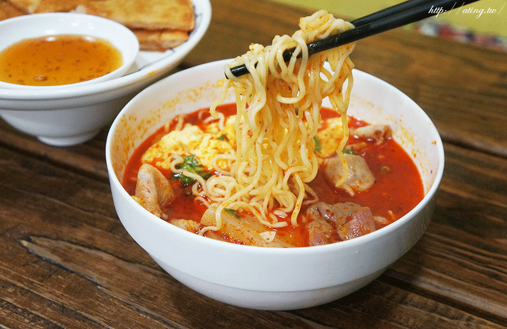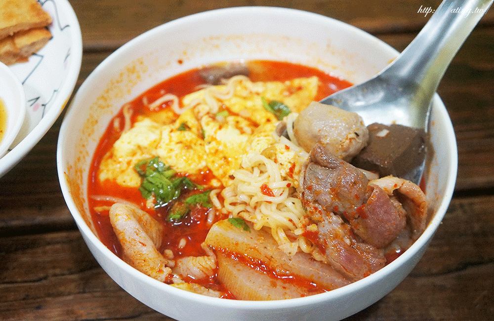 這道湯頭是紅湯,湯頭用豬骨熬煮,喝起來帶點酸辣,但辣度卻是屬於溫和的辣,湯頭滿濃郁。