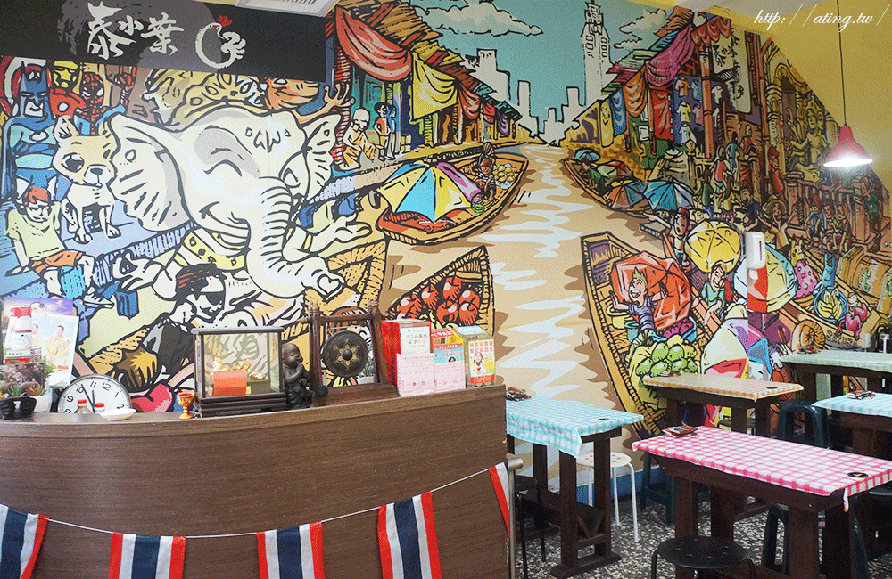 一進入泰小葉店內,我就被”泰國水上市場”彩繪牆給吸引住,天啊!畫的好美啊!