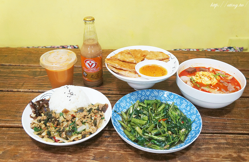 冬央豬肉湯+蝦醬空心菜+月亮蝦餅+皮蛋打拋豬肉飯+泰式奶茶+泰國vita維他牌泰式奶茶。
