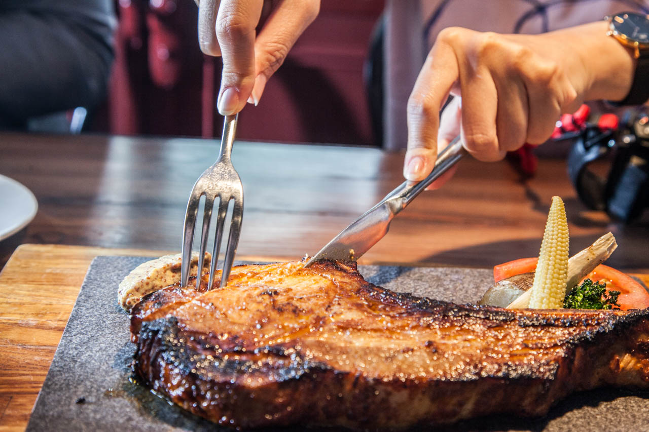 肉鬼控必點!超大支葛瑪蘭戰斧豬排經過醃漬過炭烤,外層有著漂亮金黃的烤痕且散發出濃郁的燒烤香氣