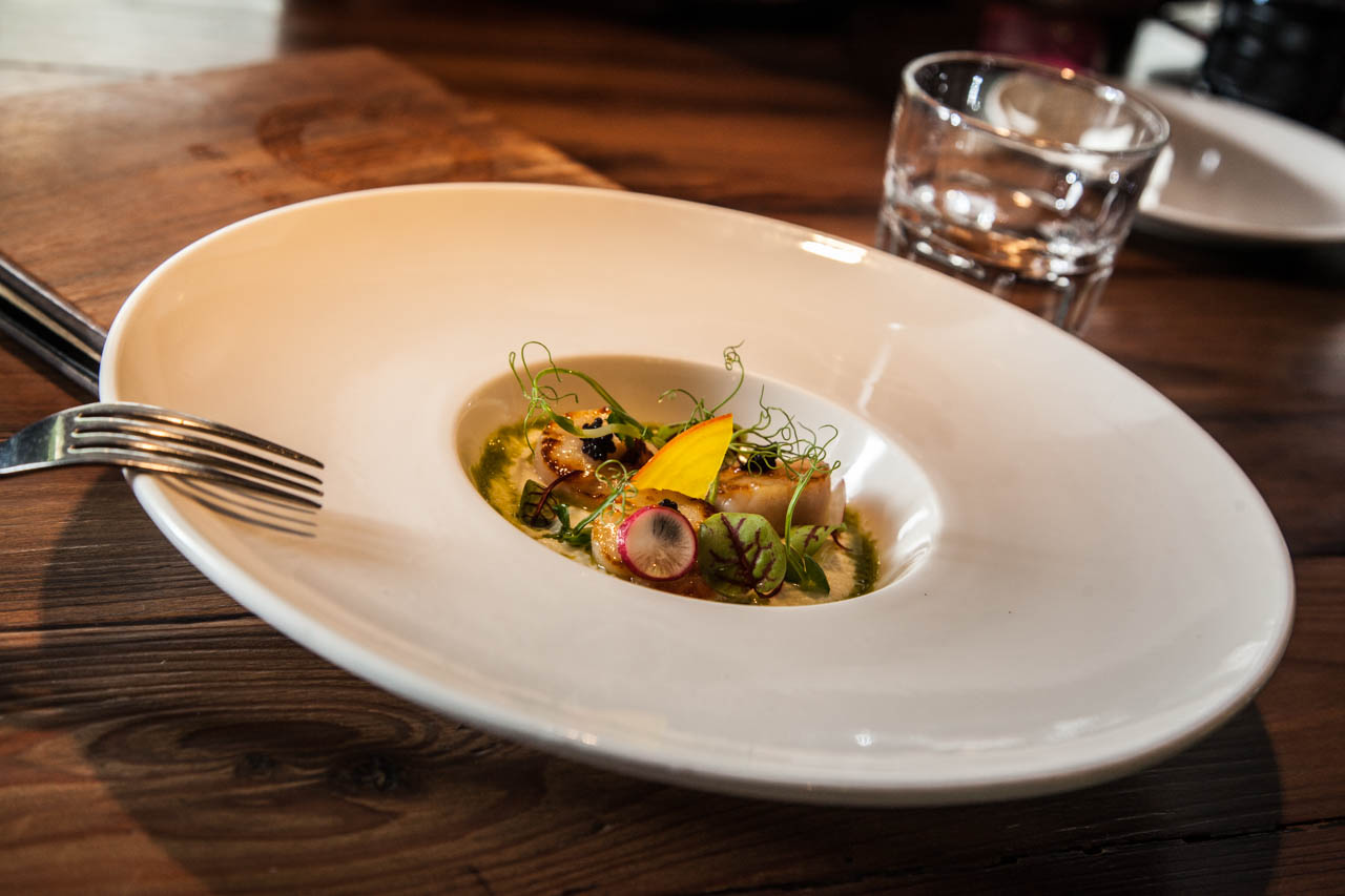 好菜上桌!來餐酒館用餐頭盤當然是來份開胃菜來開開胃囉!好米亞餐酒館使用生食級的北海道大干貝,搭配自製的花椰菜醬,擺盤看起來就像個繽紛小花園似的