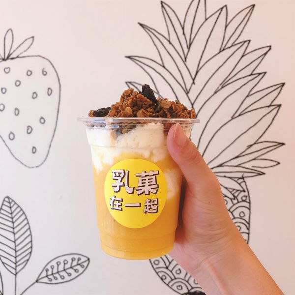 我們去白天還沒有很多遊客的大稻埕散步,再沿著河濱自行車道騎到城中區,彎進去寧波東街再訪「乳菓在一起」。現在的季節限定新品,看起來很適合不習慣吃冰的老媽,加上我們走路走了很久也有點餓了,先點個店員推薦的新品當點心:優格奶霜系列,小紫確幸&大黃雀躍(超可愛的名字^^)。