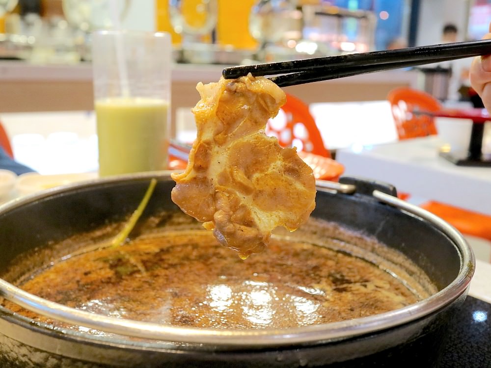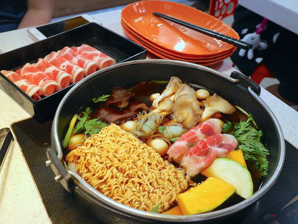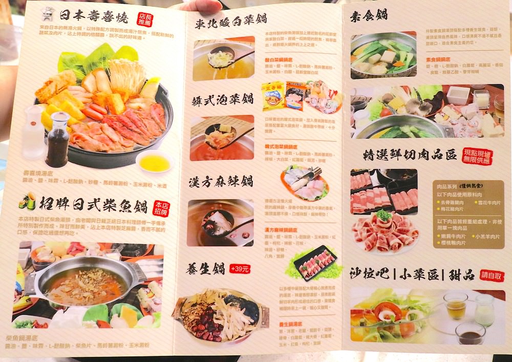 可以說是『台南CP值最高的壽喜燒+火鍋吃到飽』,光是鍋物就有:日本壽喜燒/招牌日式柴魚鍋/東北酸白菜鍋/韓式泡菜鍋/漢方麻辣鍋/養生鍋/素食鍋(共七種鍋湯的選擇),兩人同行就能任選兩鍋。