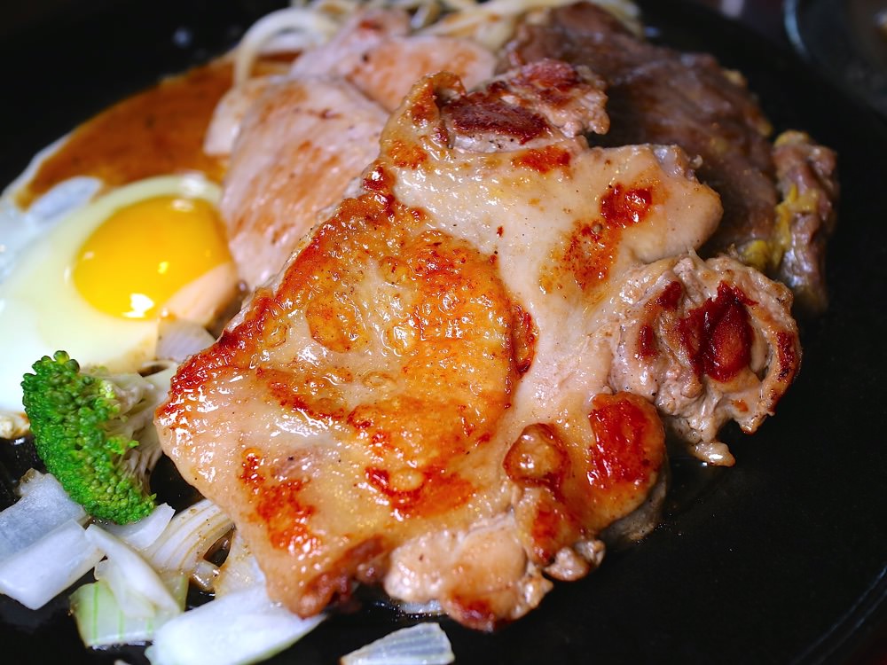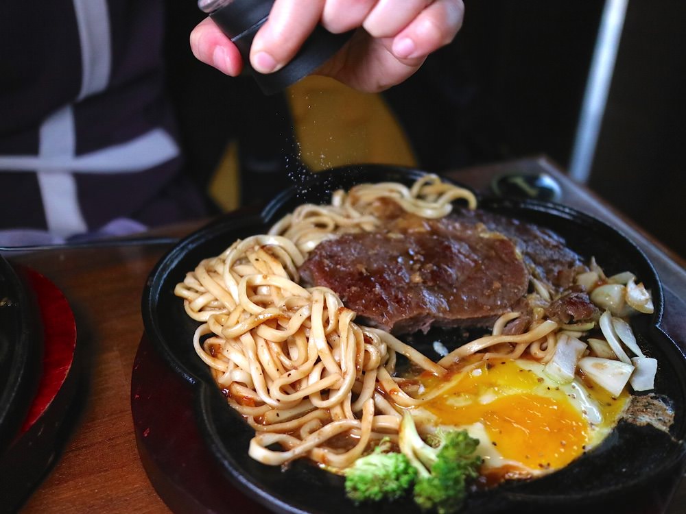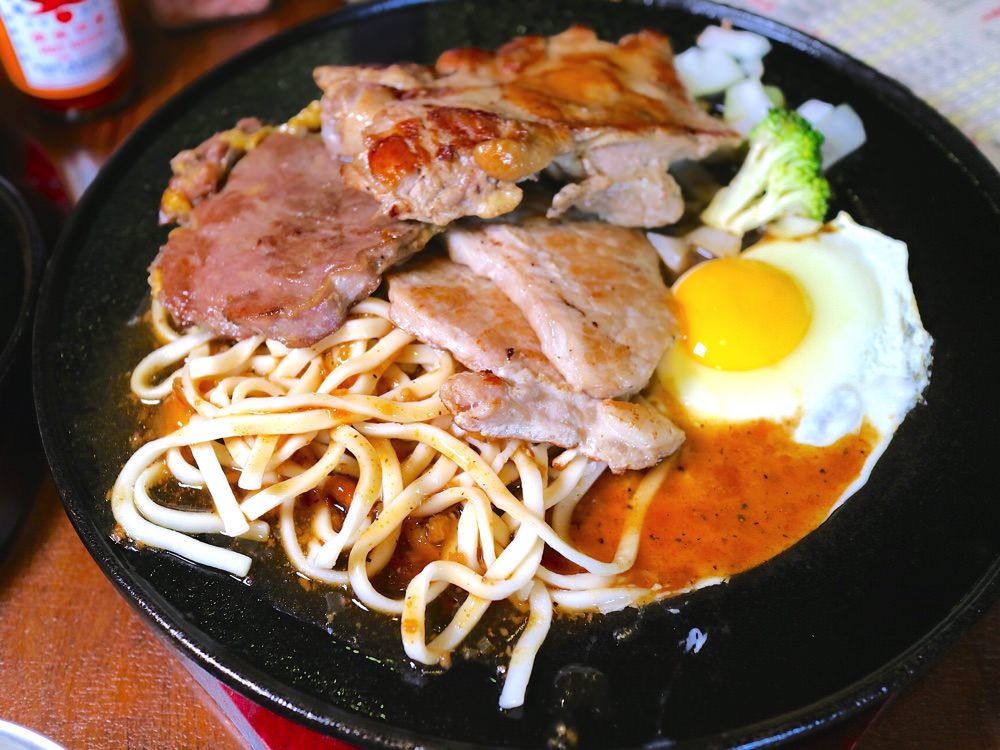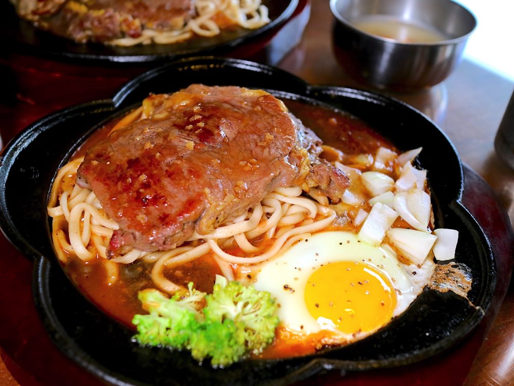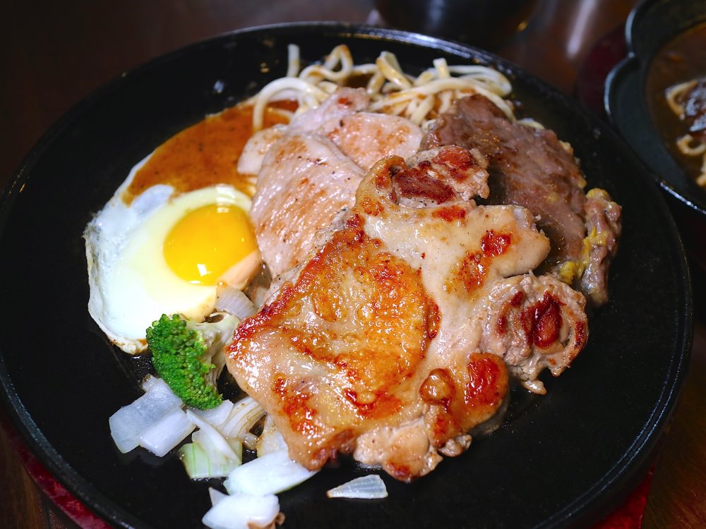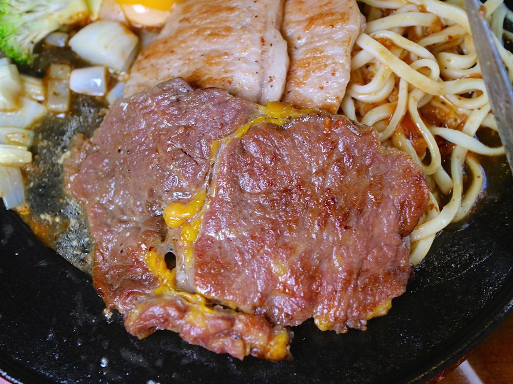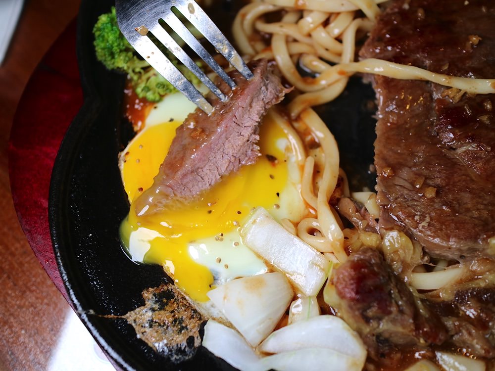 一樣有肉,有鐵板麵,半熟蛋,洋蔥,花椰菜。