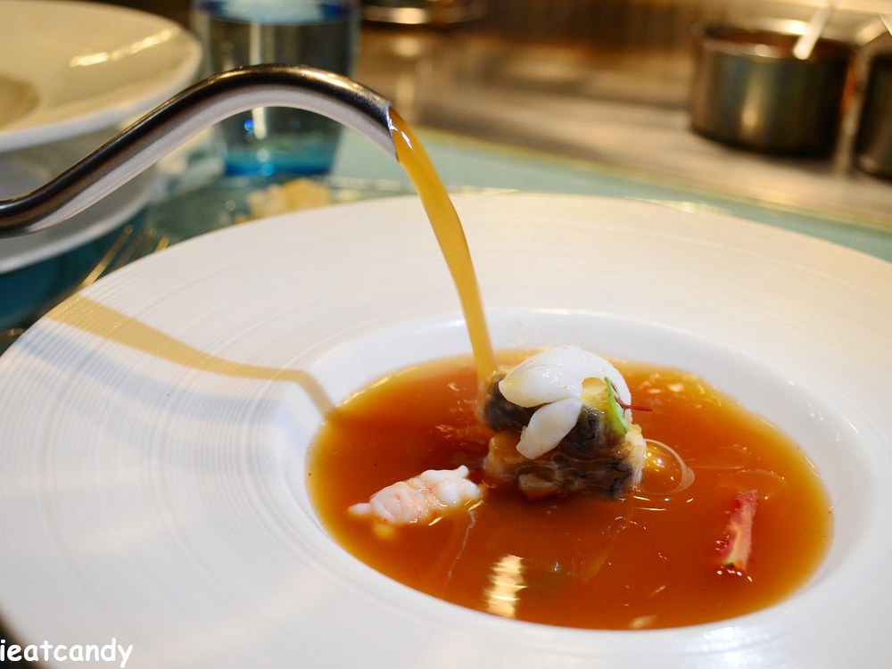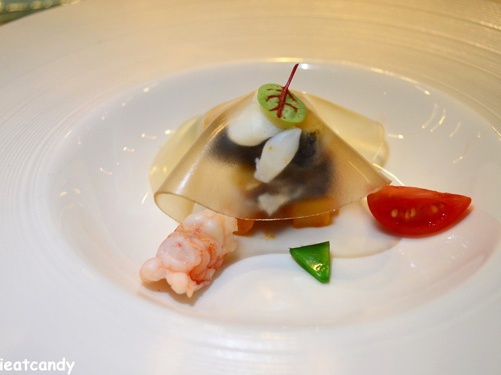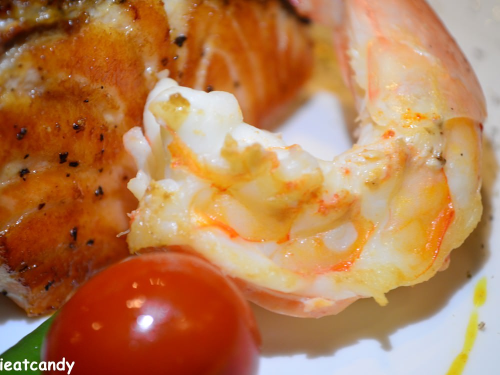 主食之一澳洲紅刺蝦、挪威鮭魚、北海道生食級干貝,果然高檔餐廳,連擺盤都美美的~(扭)。蝦子肉質緊實,蝦頭也特地處理過,能品嘗蝦頭間的濃郁蝦膏、鮭魚煎的外酥內鮮、干貝更是心頭好!最近一直跟我的干貝相見歡,整個好開心啊!