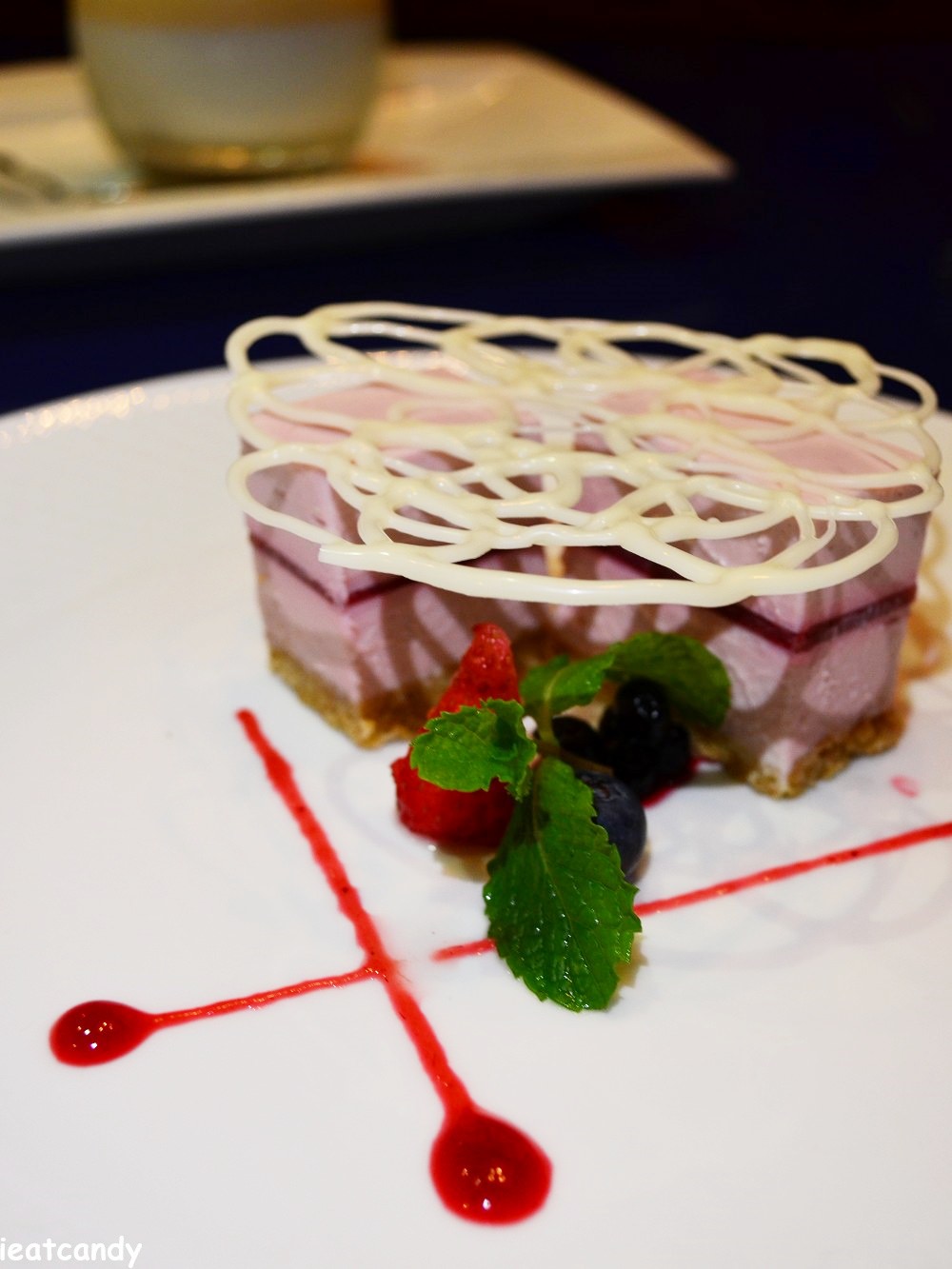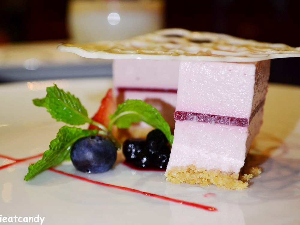 莓果甜心慕斯也是新產品,都把甜點打造藝術品般~(比甜點店還更美) 微酸的莓果慕斯蛋糕口感綿密,中間以為是果醬,結果是QQ的果凍,不會太甜膩,一旁還有草莓及藍莓可以搭配,感覺是一種很浪漫的甜點~
