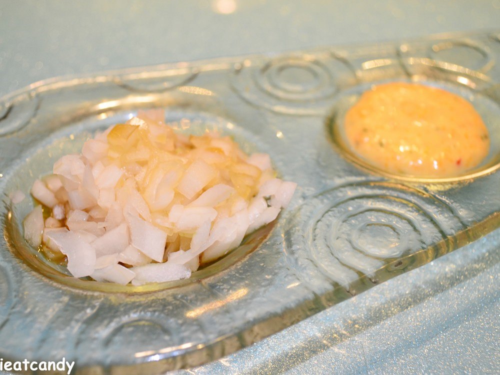 滑嫩無腥味的蒸蛋搭配一小匙的松露,瞬間奢華了起來;鮑魚愛伊特則是建議切成小塊,分別以單吃、沾醬、搭配醃漬蔬菜食用,帶點Q度、易咬的鮑魚,搭配這三種方式來品嚐,各有不同風味,口感上也會有不一樣的感受。