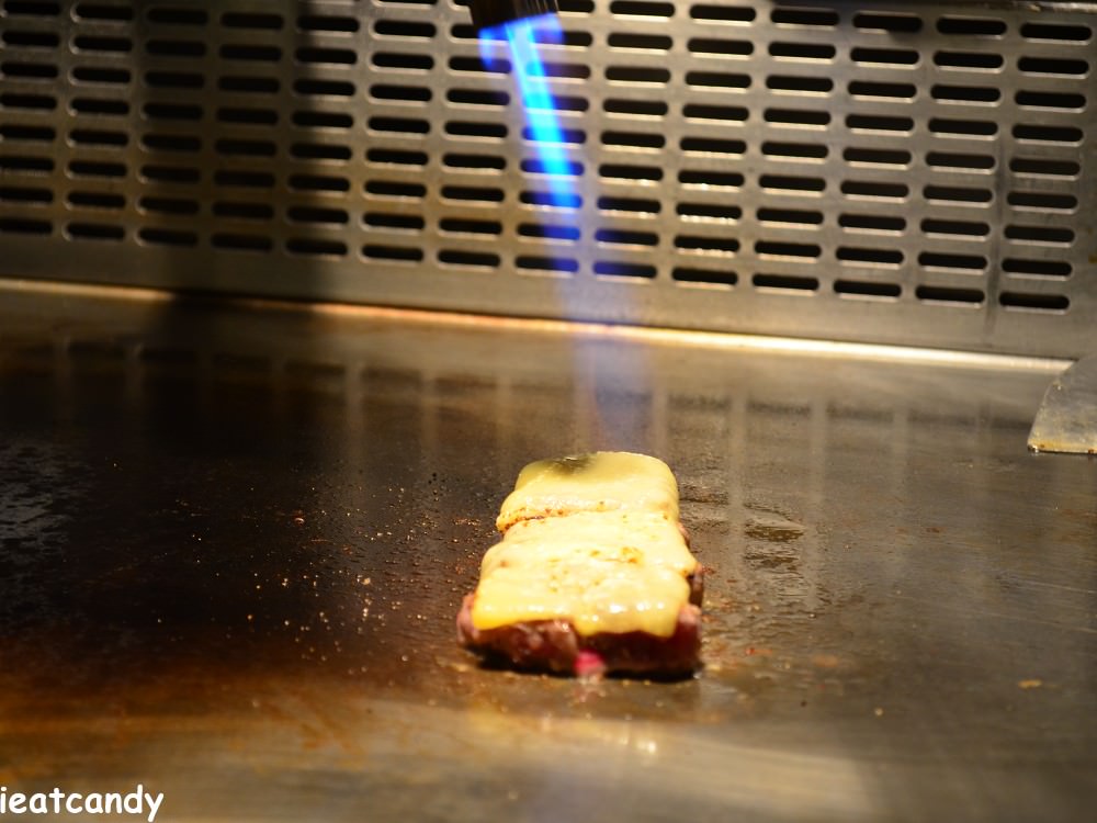 接著,主廚開始處理里肌肉,加上起司並且炙燒…