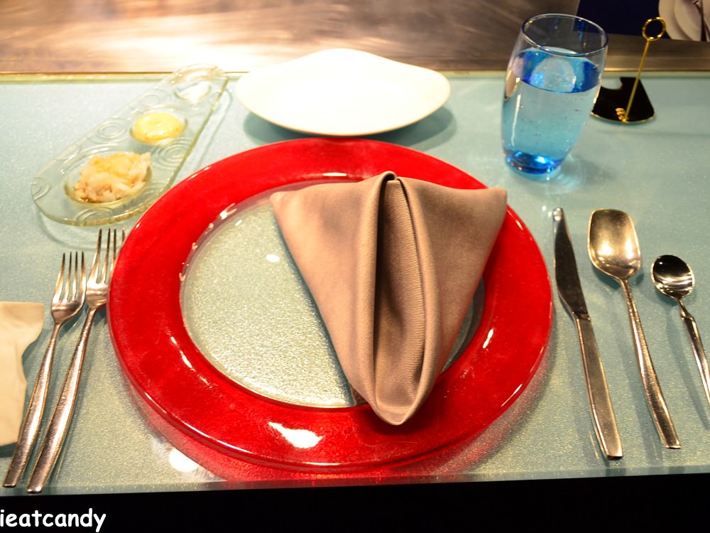 店員安排我們入座。桌上擺著講究的西餐餐具,紅色顯鮮豔的餐盤具有令人食指大動的作用。
