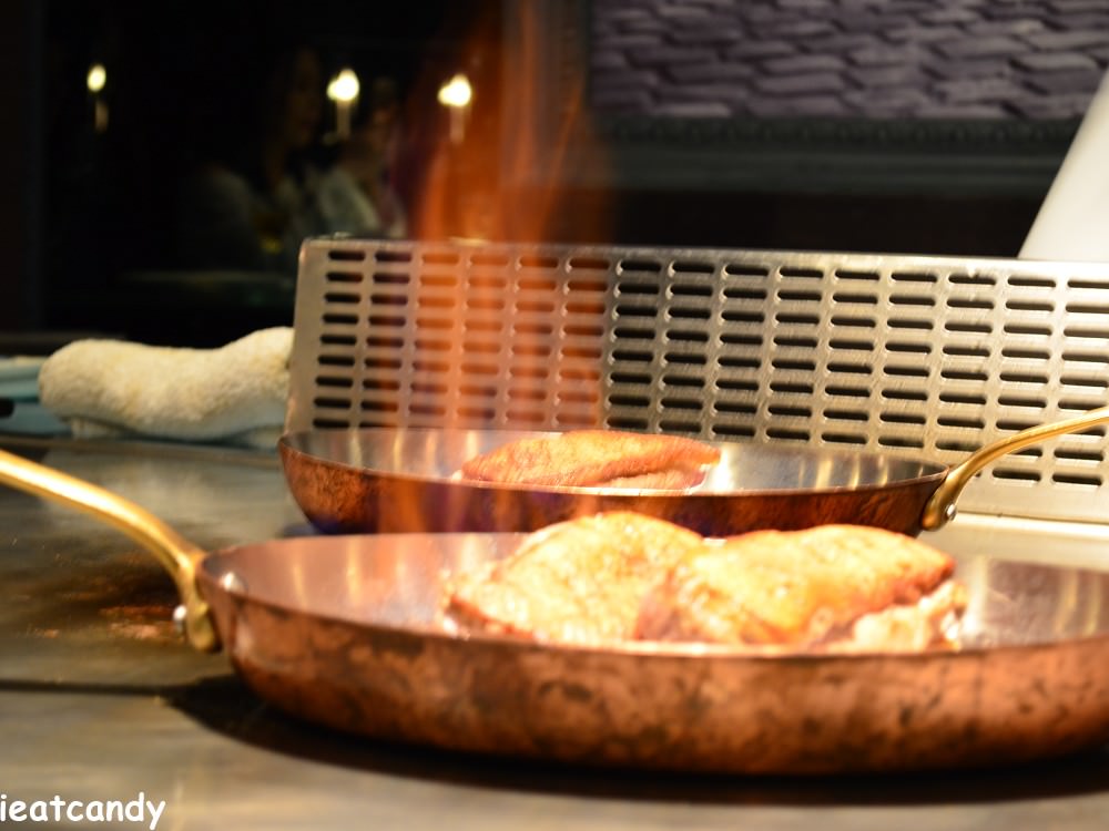 主廚還會來上一段點火秀,可惜愛伊特不太會拍,只能稍微捕捉。利用白蘭地點火烹調,目的是將肉汁鎖在其中,將鴨胸外皮煎的金黃,是很多人在網路上推薦必點的主餐。
