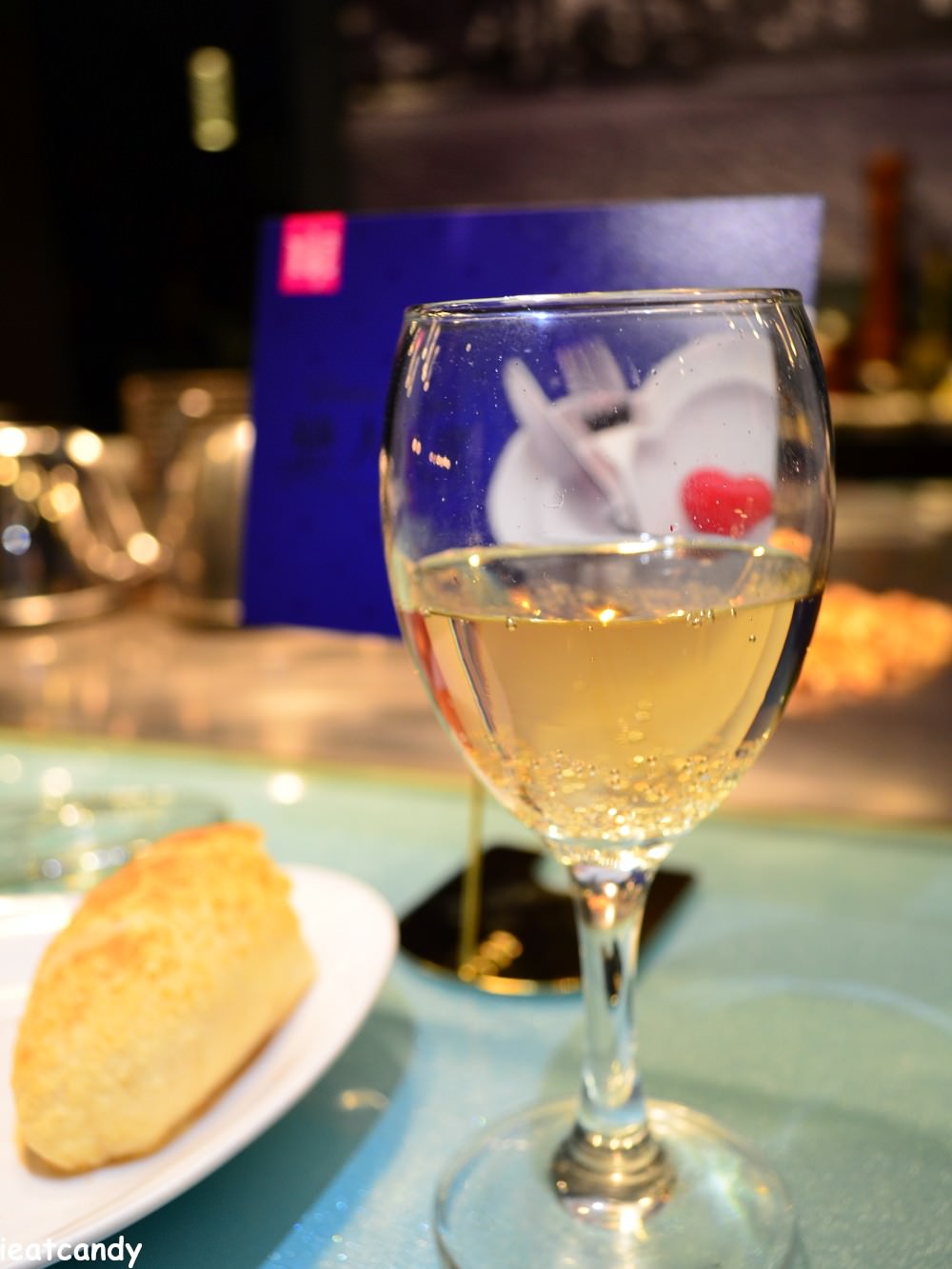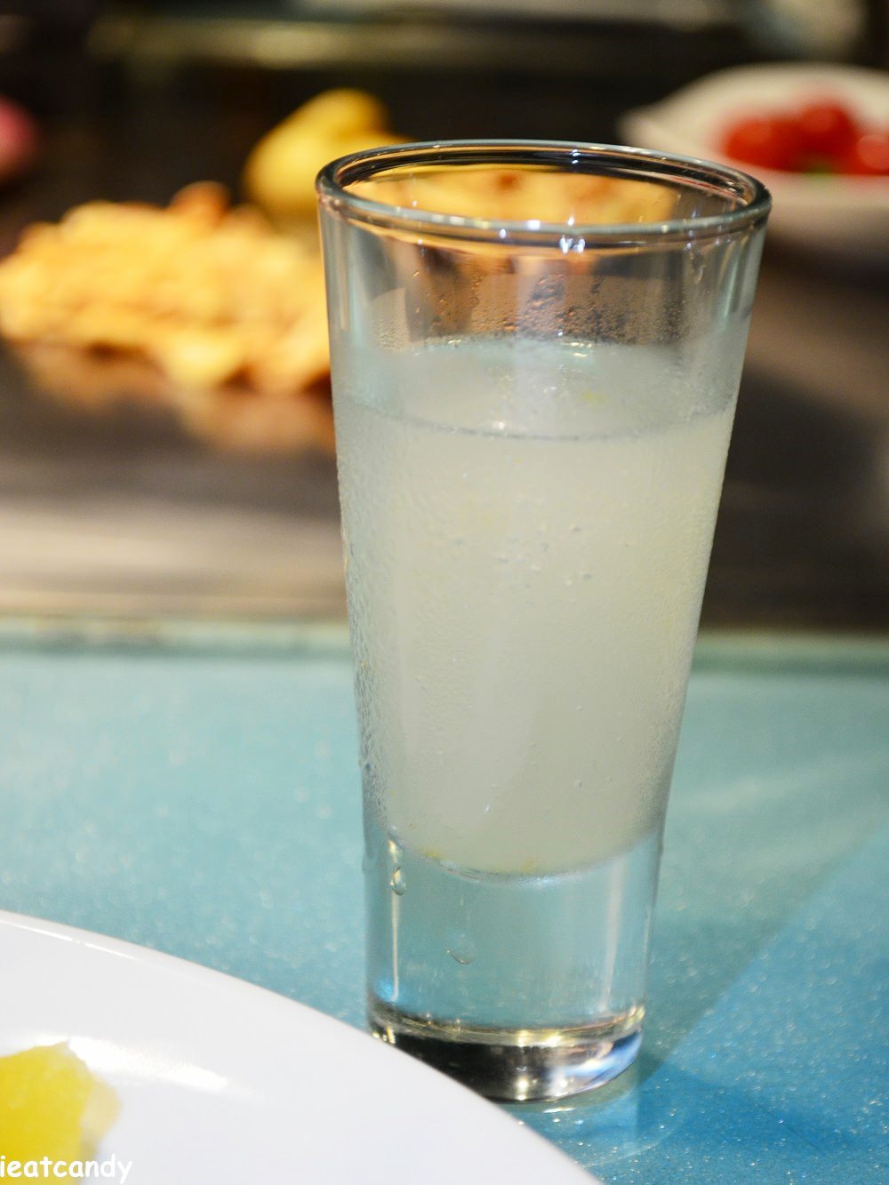 服務生會先送上無酒精的氣泡飲,香甜滋味令人忍不住一口接一口,若是沒了,店員也會即時加,是可以免費續喝的喔~
