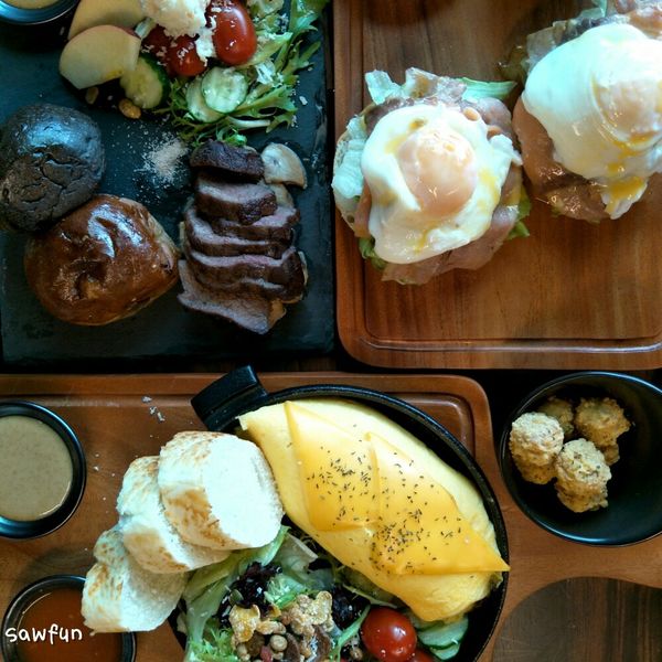 煙燻鮭魚/厚切培根/英式瑪芬/薯泥/水波蛋/帕瑪森堅果沙拉