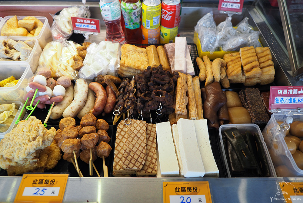 光是看門口的擺設,可能覺得跟一般的滷味攤沒什麼兩樣,但抬頭一看,多達六種口味的麻辣燙與燒滷味,馬上與常見的滷味攤做出區隔。