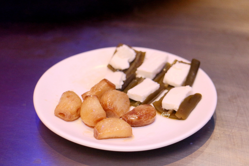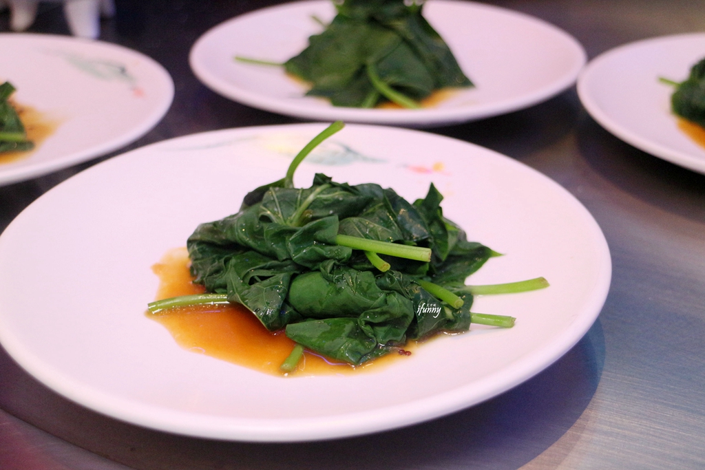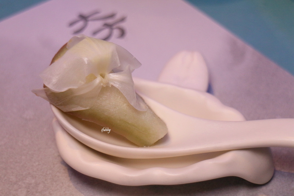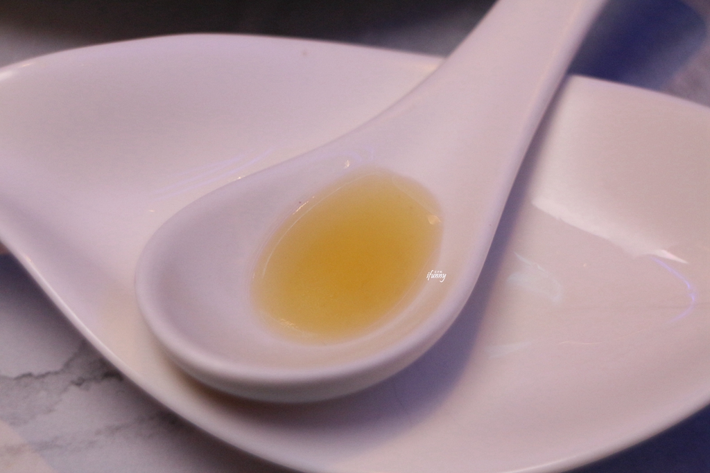 清湯看來極為清澈,入口後清香且有著蔬果的鮮甜。以鳳梨、苦瓜熬湯底,加了水蓮、枇杷、鷹嘴豆、排骨、豆腐及山藥。每個食材都恰如其份地展現風味,苦瓜味不明顯,反顯出後韻的甘甜。一道看似清淡卻很有滋味的湯品。