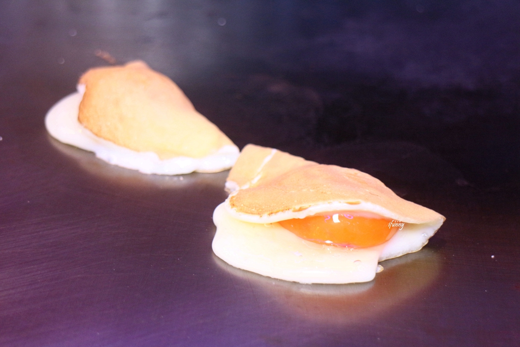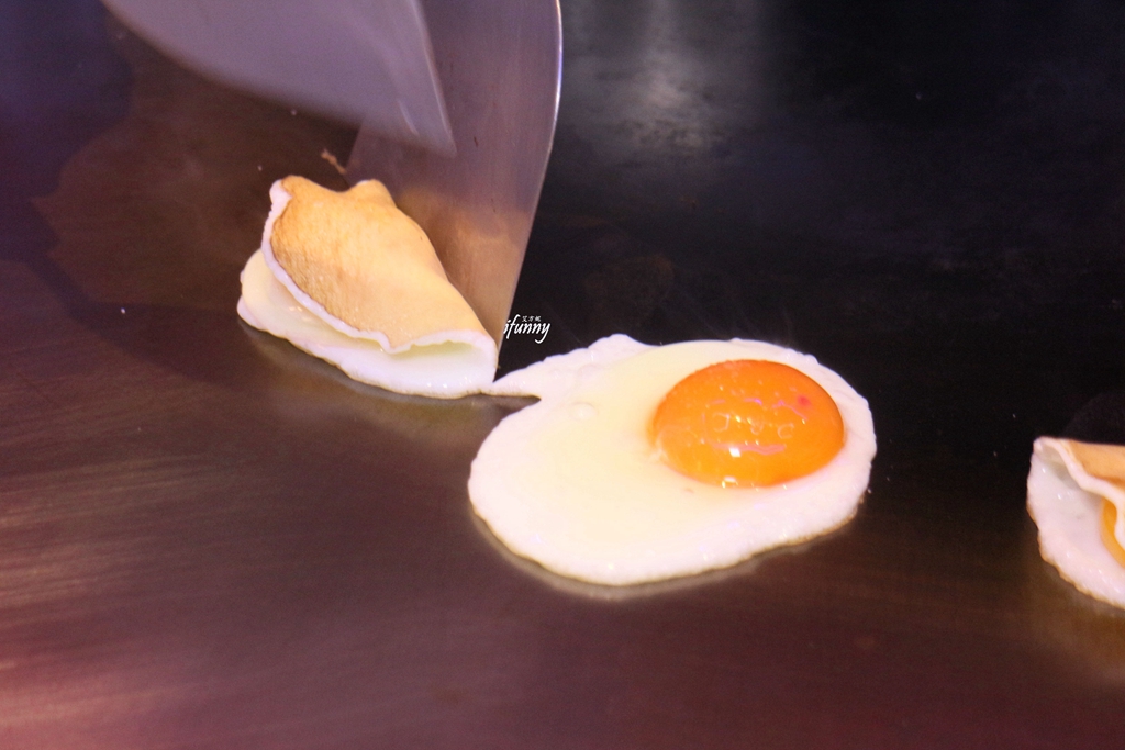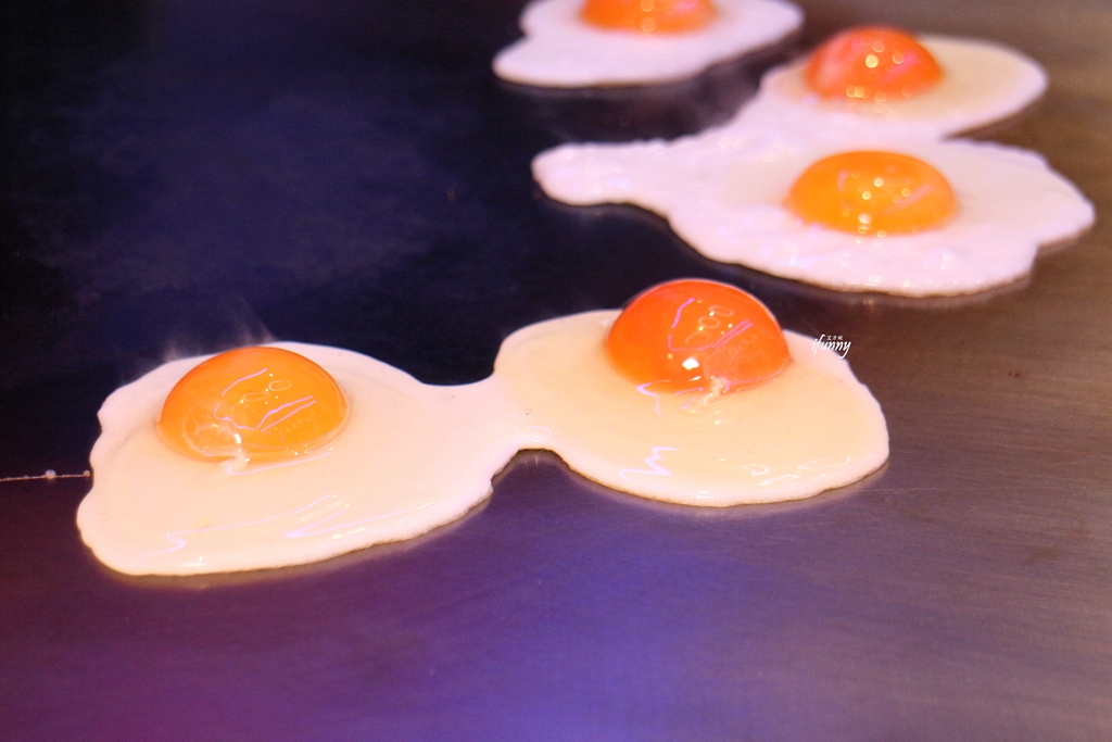 接著主廚在鐵板上打了蛋,瞧這烏骨雞蛋的蛋黃飽滿的模樣,就知其是品質極佳的雞蛋。