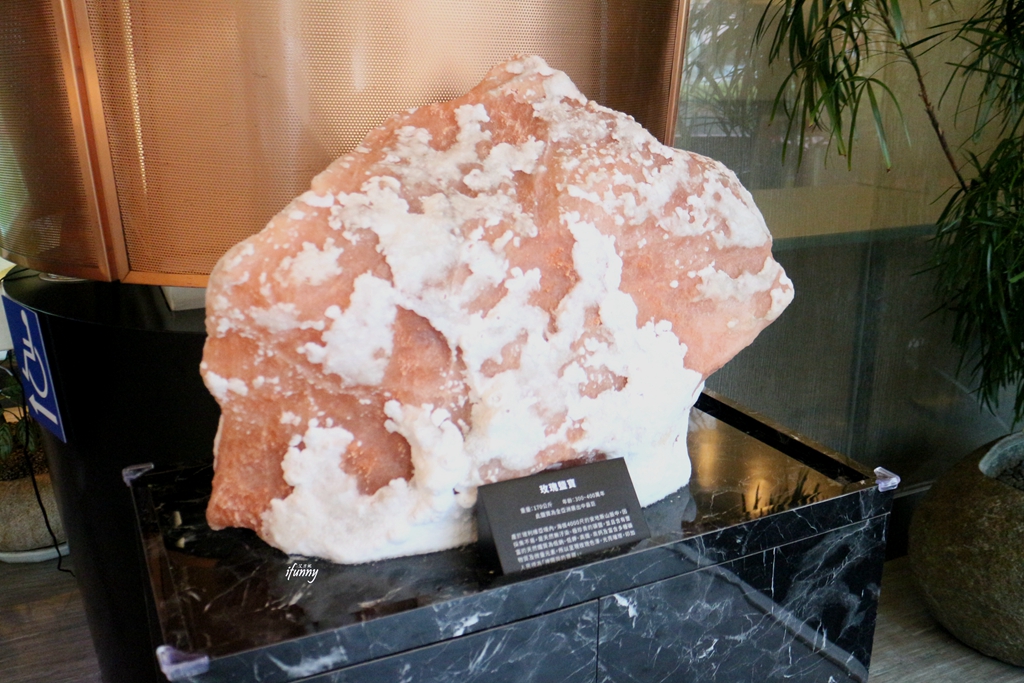 接著相當吸睛的是這一塊重達一百七十多公斤的玫瑰岩。這是來自南美洲安地斯山的鹽岩,富含鐵質,因此色澤宛如紅寶石般。大方養生鐵板燒秉持養生概念,採用這塊玫瑰岩磨成細粉的食用鹽,比海鹽要低鈉和低鉀,也更健康。