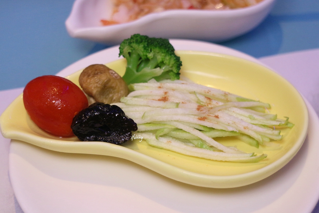 利用特殊工具將芭樂刨成易入口的絲狀,並灑以梅粉搭配,入口的酸甜十分令人喜愛。黃色是利用無花果夾入腰果製成偽巴西蘑菇的模樣。紅色的蕃茄入口也令人驚喜,竟是九層塔蕃茄,也利用梅子粉提出甜味。