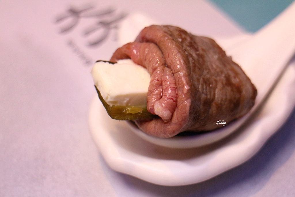 以牛肉捲起蘭嶼的飛魚卵及紫蘇葉,飛魚卵的嗶波跳躍,紫蘇葉的香氣,都使得這捲牛肉口感的層次更豐富。