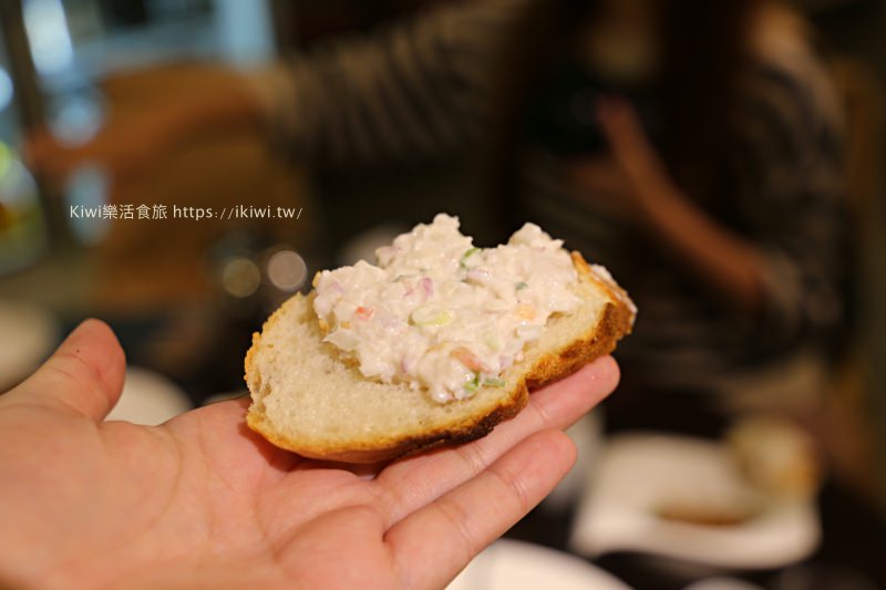 沙拉中有其餘、洋蔥、紅蔥酥、紅蘿蔔、美乃滋剁碎後做成超爽口的沙拉,最後搭配撒上玫瑰鹽的法棍麵包,中西式的合體吃法,最初的第一口是平淡的,咀嚼了幾口後,欲罷不能又偷偷吃第二片><