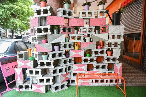 外頭放置了塗上粉色的水泥磚