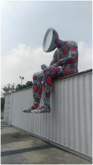 安地羊的光影巨人坐在Dali Art國際藝術駐村的貨櫃屋工作坊上,沒錯,就是貨櫃屋。有人說光影巨人身上的圖騰有種密集恐懼症引發可能…,現場見證,毫無恐懼感,只有驚嘆與欣賞!