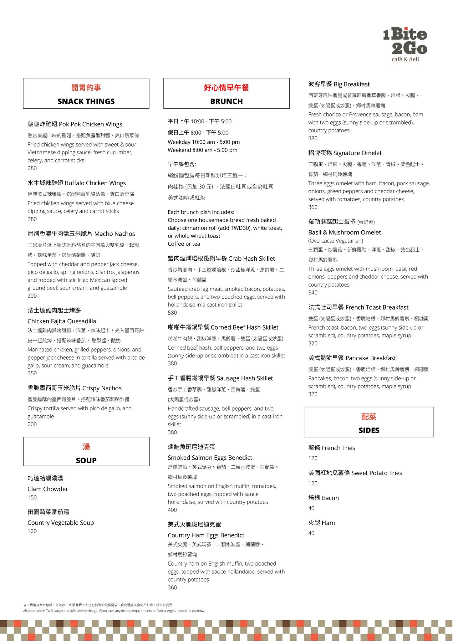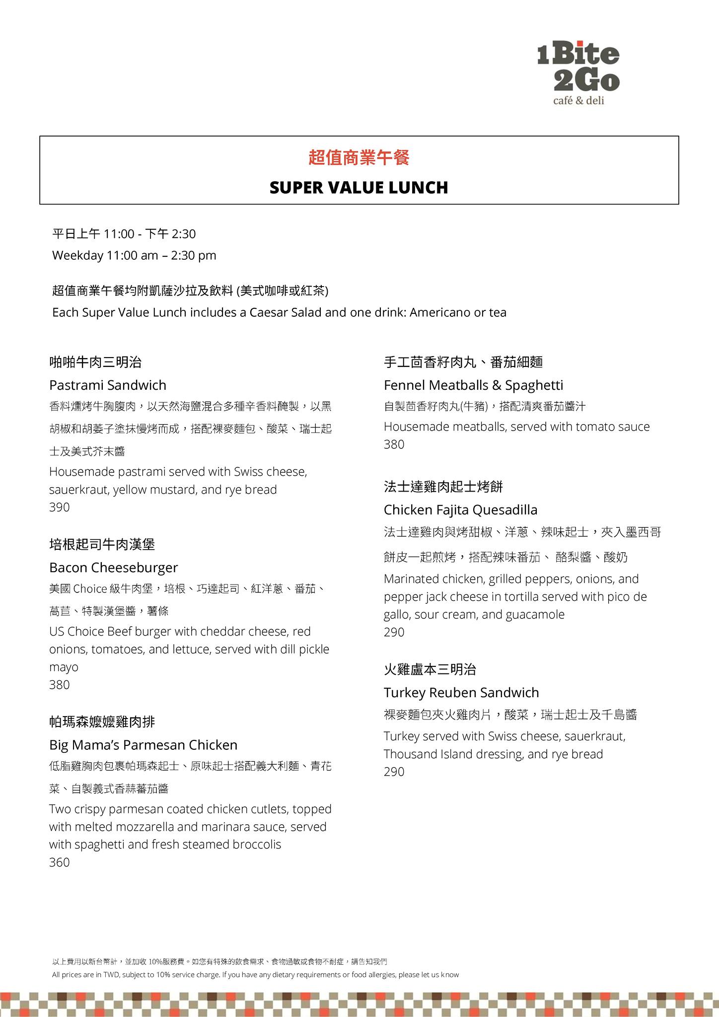 1Bite2Go Café & Deli提供早餐、早午餐、下午茶到晚餐的全時段餐點,因此全時段的客人是絡繹不絕的。