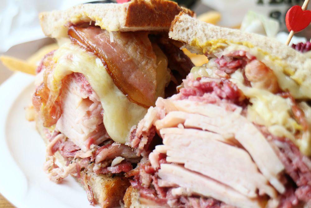 以一手無法掌握的三明治,牛胸腹肉的滋味濃郁略帶嚼勁,而清淡的火雞肉中和了整體的味道,另外酸菜及美式芥末醬的酸度也提供了解膩感。