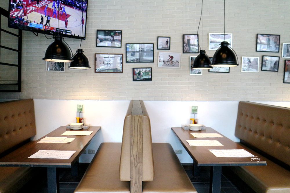 高背式的沙發正是美式餐廳的代表啊!搭上磚牆、相框及檯燈,整個很有美劇的氛圍。