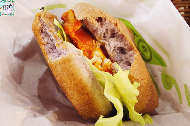 ♡韓風辣雞腿紫米漢堡-滿滿的蔬菜夾雜在其中,真的非常養生啊!