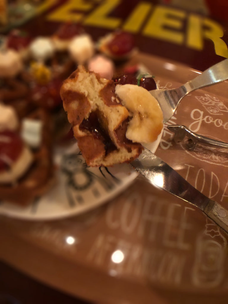 鬆餅上有新鮮的葡萄、香蕉,尤其是鬆餅吃起來外皮酥脆裡面柔軟,蛋奶味很濃醇,由於店家堅持手工製作,所以真的要稍等一下下餐點