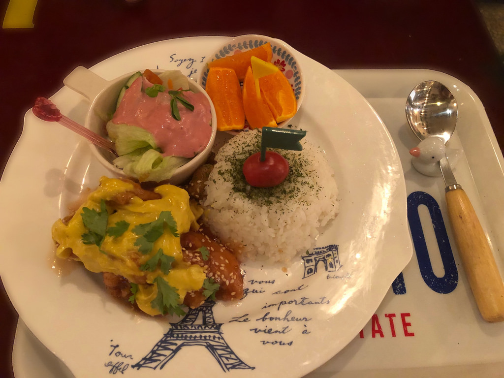 ▲「塔塔雞(簡餐)」糖醋的口感很下飯,雞肉本身不柴,蠻嫩的,附的沙拉感覺也很新鮮;沙拉醬還蠻好吃的,水果是葡萄柚、很香很甜