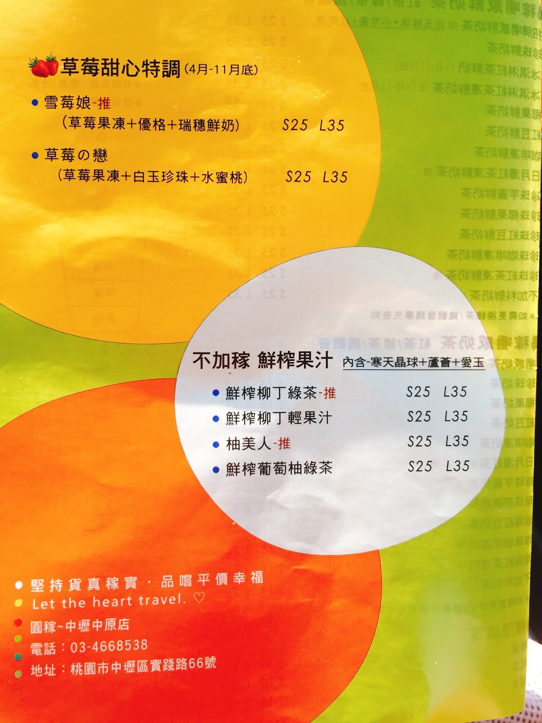 圓稼嚼感觀音鮮奶茶從中部來的『圓稼嚼感奶茶』,根本就是『原價』超級佛心的通通最貴也才35元還是大杯的超級親民的讓隔壁曾經風靡一時的店家人潮都被吸引過來了圓稼嚼感觀音鮮奶茶[白玉波霸+芋圓+紅茶凍]另外還有店家推薦的鮮榨柳丁綠茶裏頭也是有〔寒天晶球+蘆薈+愛玉〕店家資訊🔍圓稼嚼感奶茶專賣👣地址:桃園市中壢區實踐路66號📱電話:03-4668538🔖營業時間:10:00-22:00