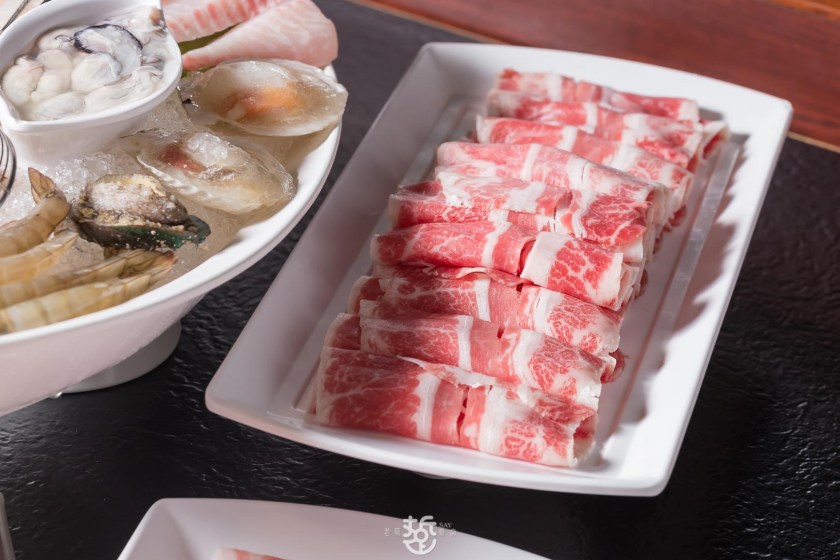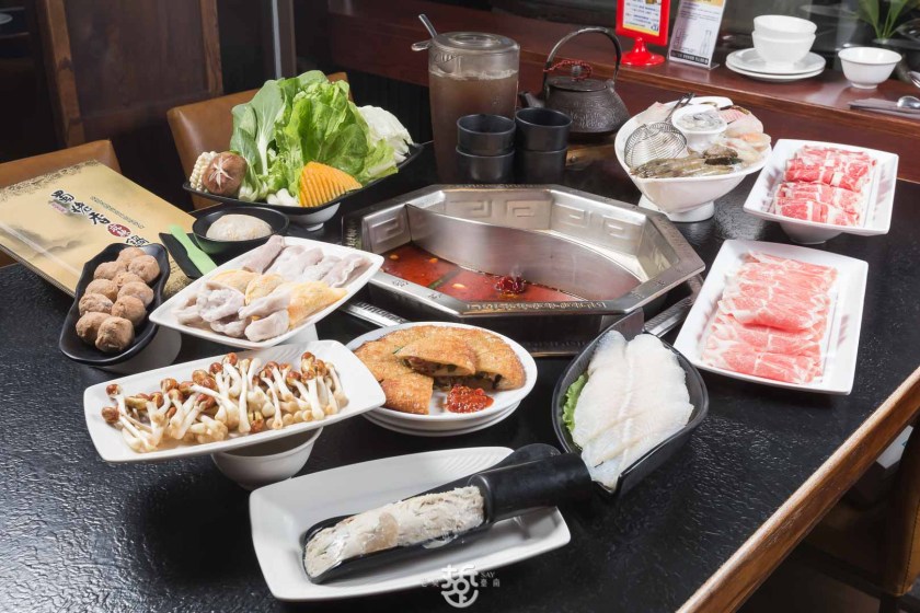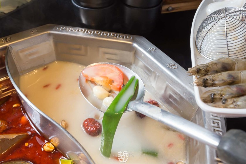 這裡的鍋底有兩種口味,可以選擇養生白湯鍋、麻辣鍋與各半的鴛鴦鍋。麻辣鍋的湯頭裡有燈籠椒、荳蔻、月桂葉等20多種中藥材及辛香料。而白湯用豬骨與雞骨文火慢熬成乳白色,湯裡不加人工湯粉。