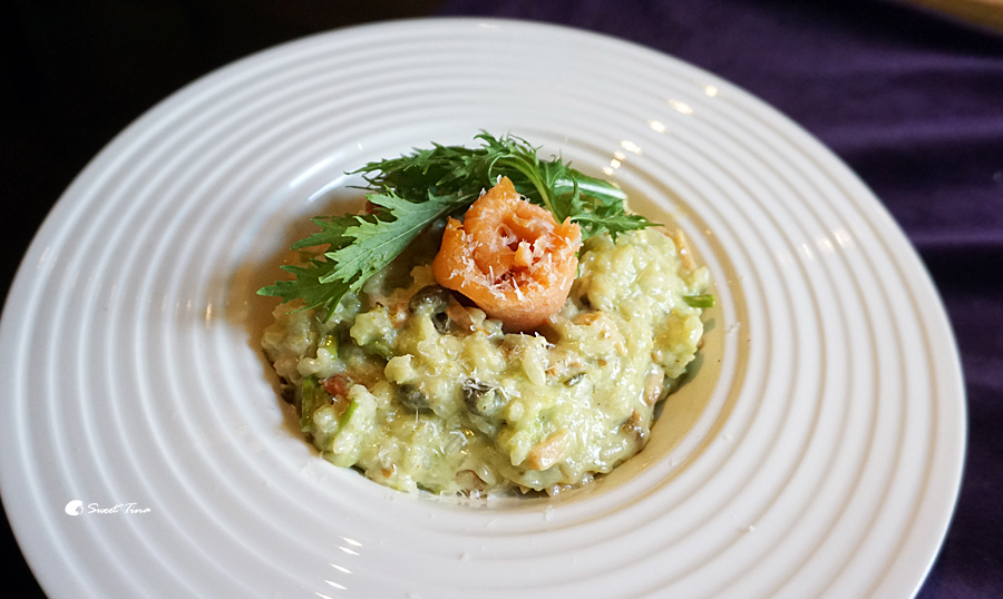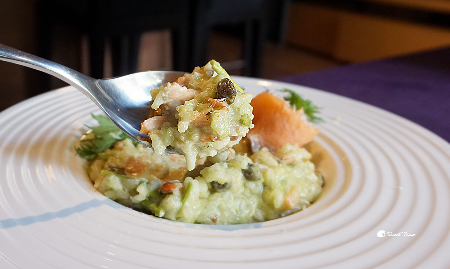 燻鮭魚山葵奶油燉飯 - 以現磨山葵料理燉飯,帶點嗆帶點辣,讓看似溫和的奶油燉飯多些野味,不過記得小口吃啊,習慣大口吃飯的我第一口真的是要噴淚了,哈!