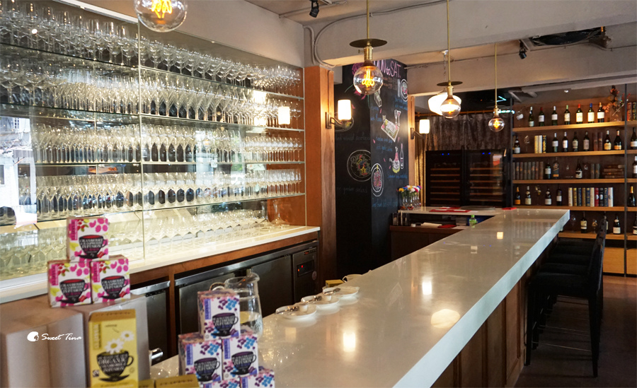 餐廳中間設立了偌大的吧檯,櫃子上滿滿的玻璃杯,很有餐酒館的氣氛。
