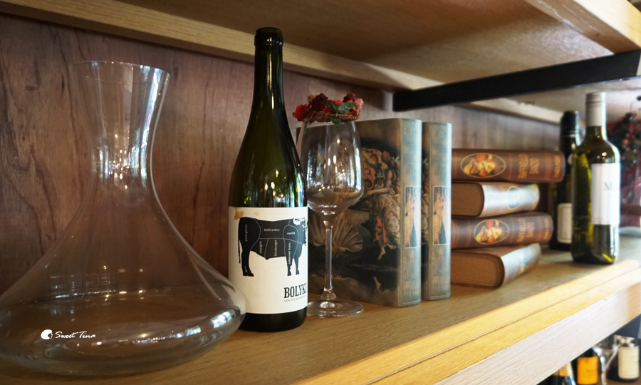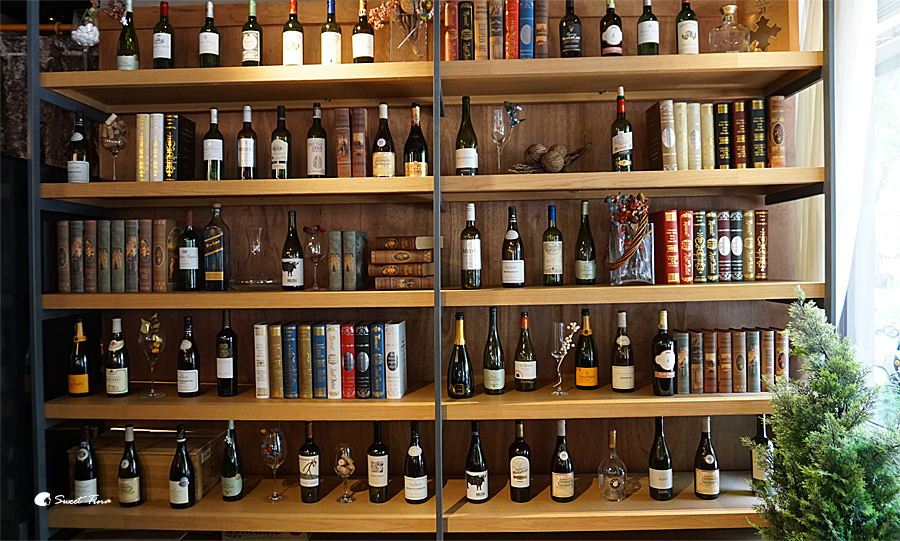 一旁的櫃子上擺放了各種的酒瓶,好有氣勢啊。