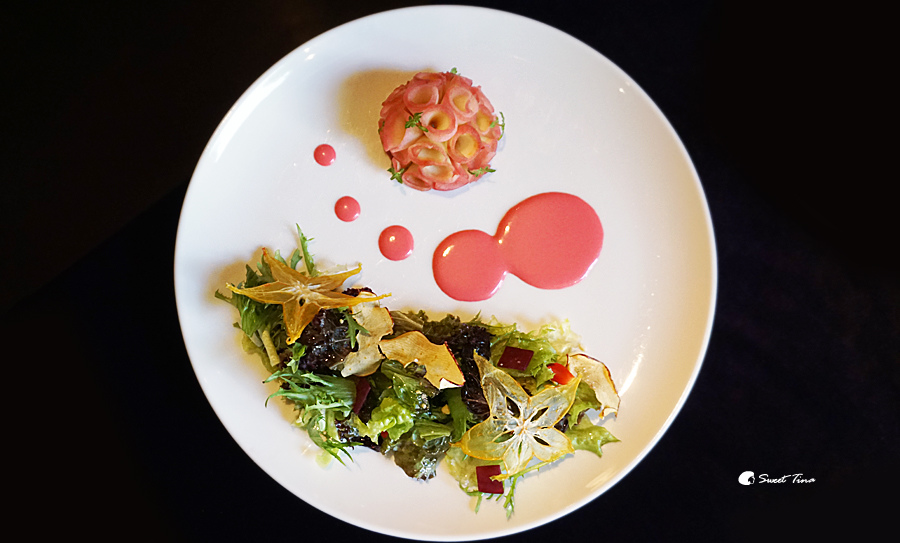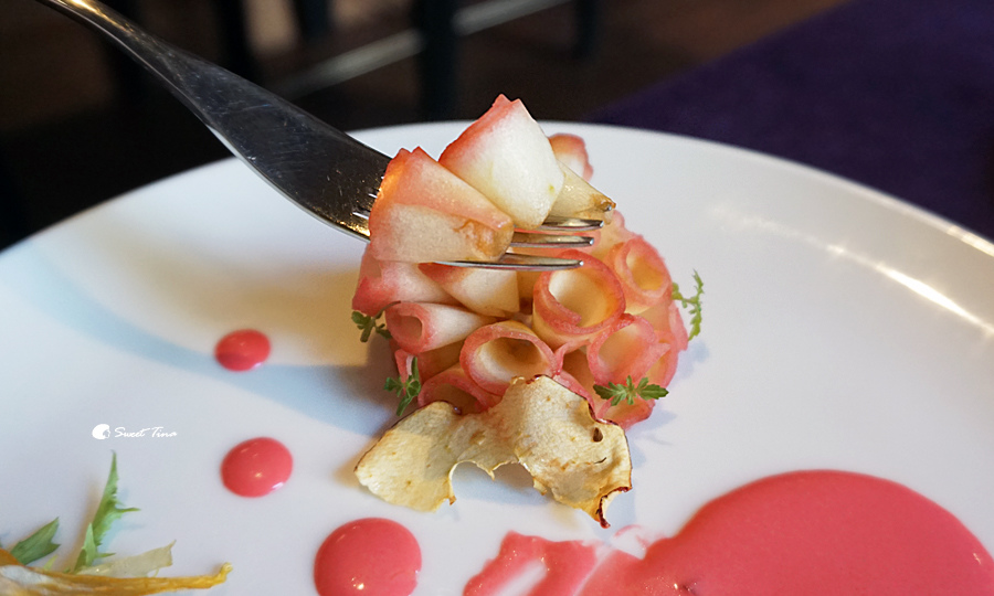 洛神花之戀 - 以洛神花和優格調配出的粉紅醬汁,真的好美啊,而一旁的花朵造型則是蘋果與洛神花一同浸泡後呈現出的色調,實在太賞心悅目了。