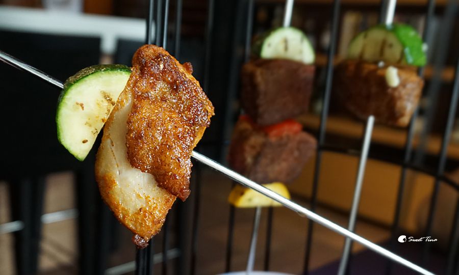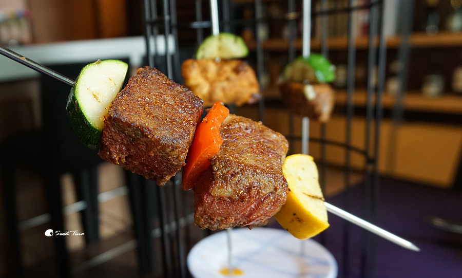 摩洛哥碳烤肉串 - 以梅花豬肉、去骨雞肉、牛小排做為肉串的搭配,搭配特製的香料後,肉串香而不鹹膩,掛肉串的鳥寵也好吸晴啊,讓我拍個五十張再吃吧XD~ 廚師真的太有創意啦。