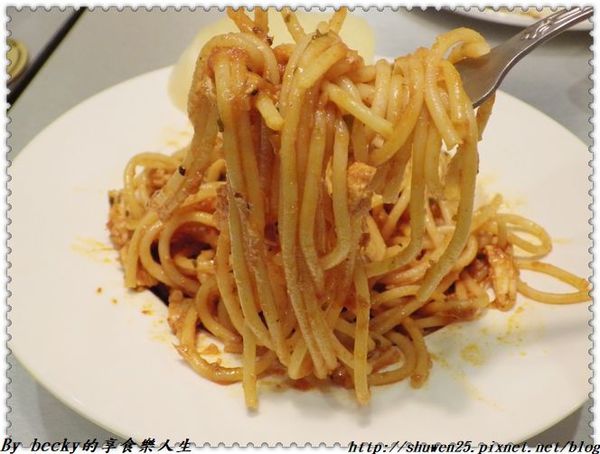 麵食上有少許的雞胸肉及起士,旁附上了一片大蒜麵包,麵條還蠻Q彈的,蕃茄醬汁味道濃厚,發現到每一道都有很濃稠的蕃茄味,吃起來有點微酸甜,很容易飽足,配上大蒜麵包的甜香味,中和了濃厚的蕃茄味。