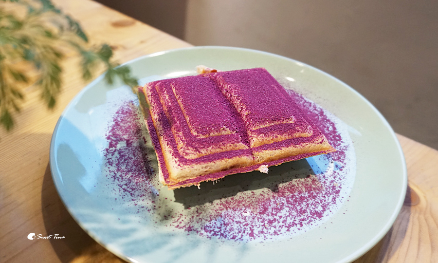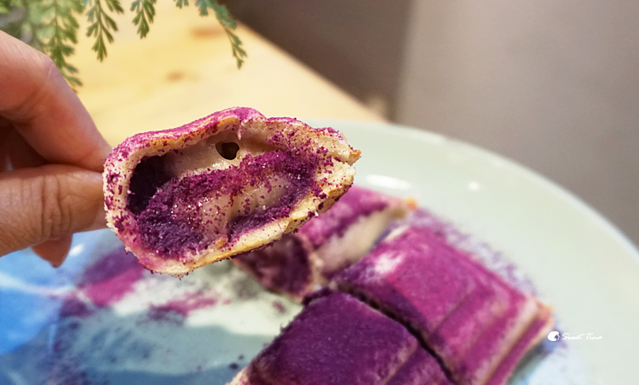 「星期六」髒髒吐司 - 外層灑上天然紫薯粉,內餡為手作紫地瓜芋頭起士,雖然是以二層吐司熱壓,但裡頭可是滿滿的餡料呢。