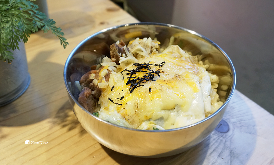 歐巴拌麵 - 韓國泡麵、季節時蔬、特製安東醬、安東雞、起司、半熟蛋搭配而成,一碗拌麵裡可是滿滿的料。