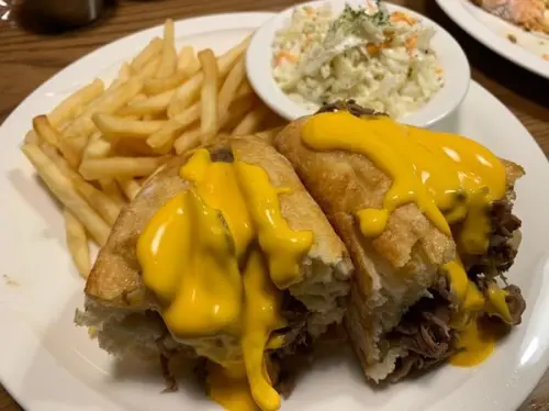 啪啪牛肉三明治使用牛胸腹肉,以天然海鹽混合多種辛香料醃製,裸麥麵包內夾著酸菜、瑞士起司及美式黃芥末醬,並附上薯條看起來好膨湃了