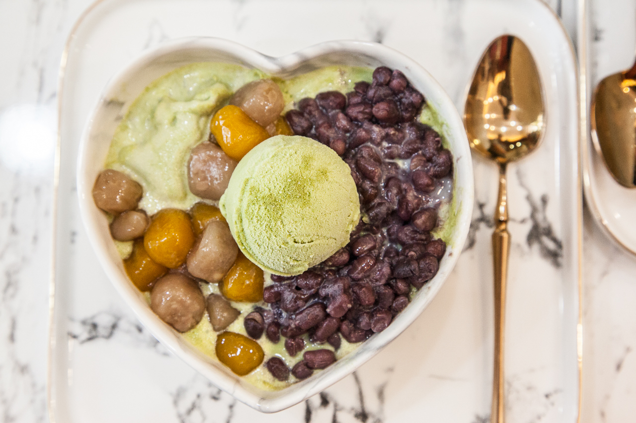 抹茶控必點!雪花冰是抹茶口味的,上面加了兩大球抹茶冰淇淋,配料紅豆跟芋圓也是鋪滿滿,碗還是愛心造型,少女心大噴發!