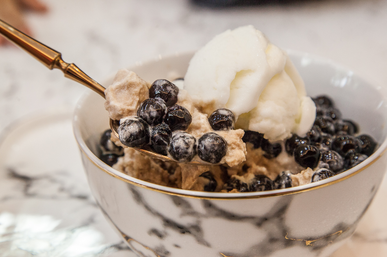 如果跟咬咬一樣也選擇障礙的冰友,直接點綜合鮮果激爽,所有的水果料都有,有愛文芒果、西瓜、奇異果、哈密瓜再加上兩大球牛奶冰淇淋,料鋪得滿滿都看不見下面的冰了,而且天下奇冰Icever 南崁店的容器也好有質感,都是大理石花紋,還用金湯匙呢