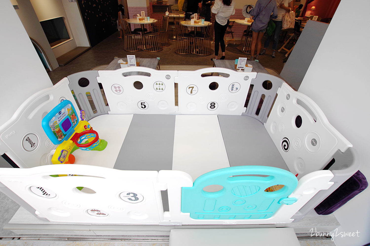 座位區旁邊就是爬行寶寶的專屬遊戲區,地面鋪設了軟墊,四周還有柵欄圍著~