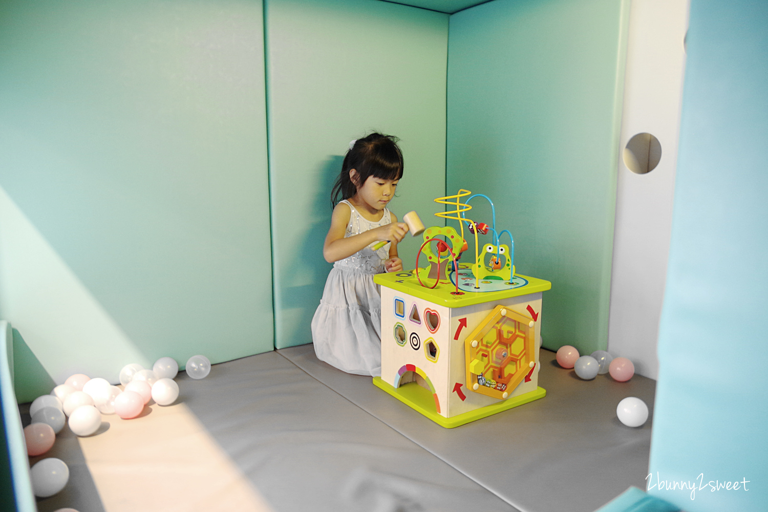 座位區旁用軟墊圍出了一個小球池~粉色、灰色、白色、透明~連球的配色都這麼美、這麼夢幻~