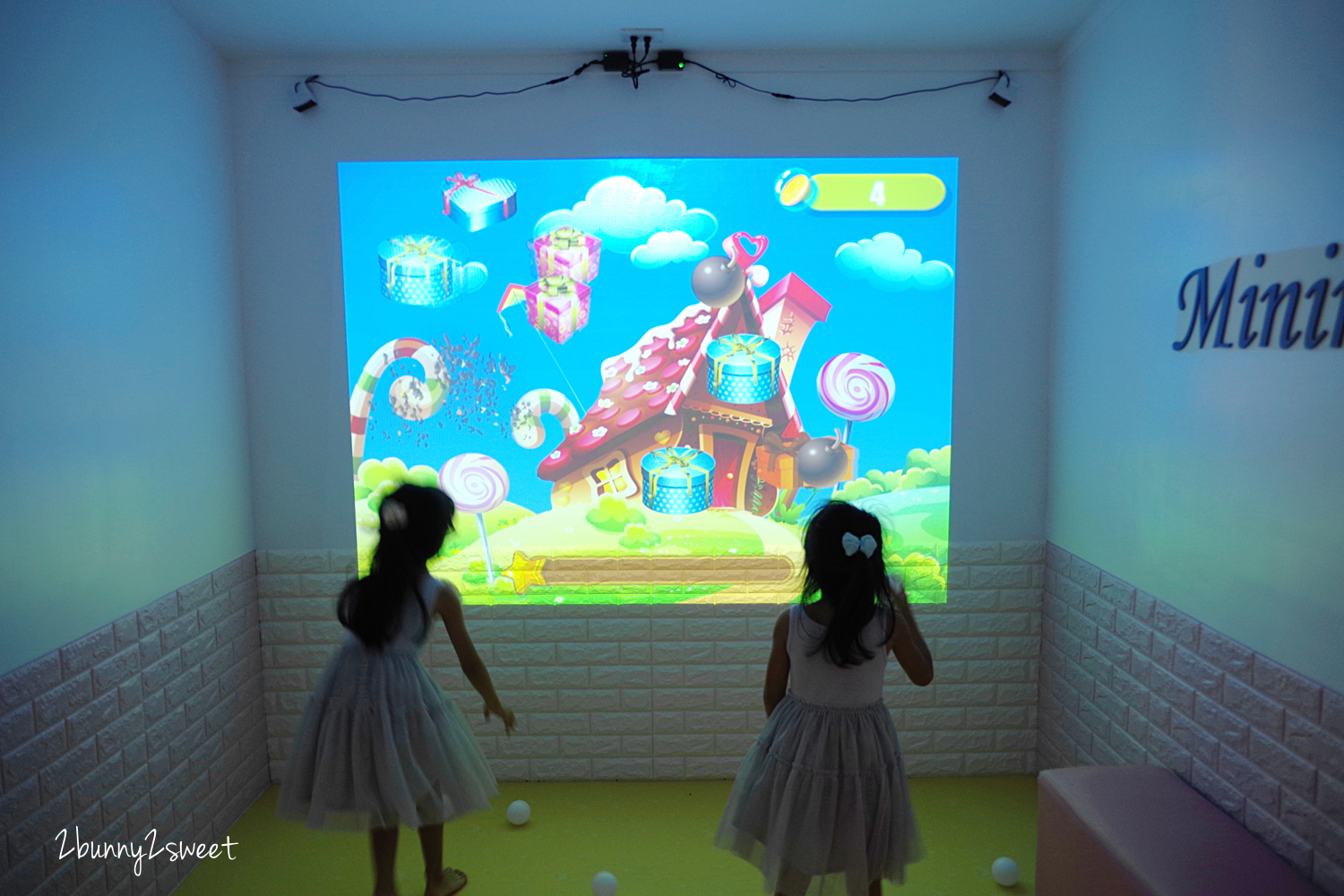 投影機會投射影像到牆面,小朋友可以用手拍或是拿球砸,打破牆上的氣球、趕走怪物、撿禮物…