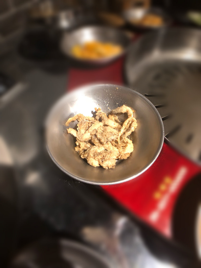 店員也很推這個,我一樣還是沾著豬肉吃,它的口感很奇妙,還沒沾醬前我看那一粒粒很像是鹽巴,