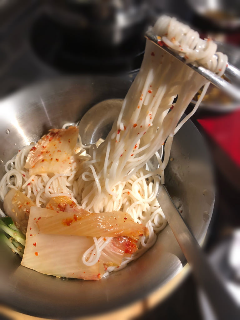 但是吃起來又不像是一般的麵條,很像是台灣粗一點的麵線,配上泡菜以及小黃瓜還有芝麻,夏天吃這個真的很消暑,